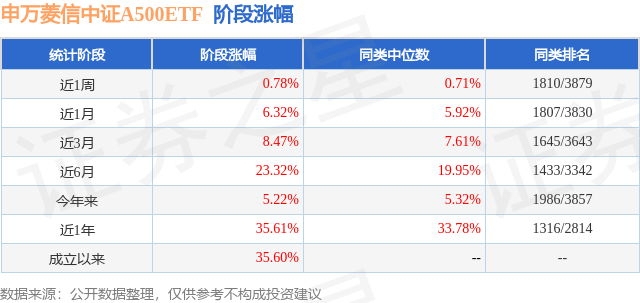 从业绩表现来看,申万菱信中证A500ETF基金过去一年净值涨幅为35.61%,在同类基金中排名1316/2814,同类基金过去一年净值涨幅中位数为33.78%。而基金过去一年的最大回撤为-11.68%,成立以来的最大回撤为-11.68%。